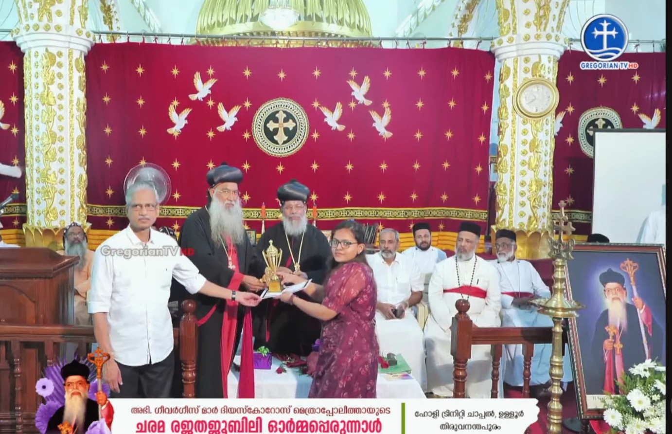 The winners of GCAS Intercollegiate English Speaking Competition receiving Prizes from H. G. Dr.Joshua Mar Nicodimos Metropolitan, H.G Dr. Gabriel Mar Gregorios (the College Manager) and Dr. R. Gopakumar (the Principal) from the Prize Distribution Ceremony in Holy Trinity Church, Ulloor on 21 July 2024. In the absence of the Intercollegiate English Elocution Competition First Prize Winner, Mr. Soju C Jose, his brother, Mr. Shibin receiving the Cash Prize of Rs 3000/-. Second Prize Winner, Ms. K.J. Indraja, receiving the Cash Prize of Rs 2000/- and Third Prize Winner, Mr. Rohith Aji Cherian, receiving the Cash Prize of Rs 1000/-.