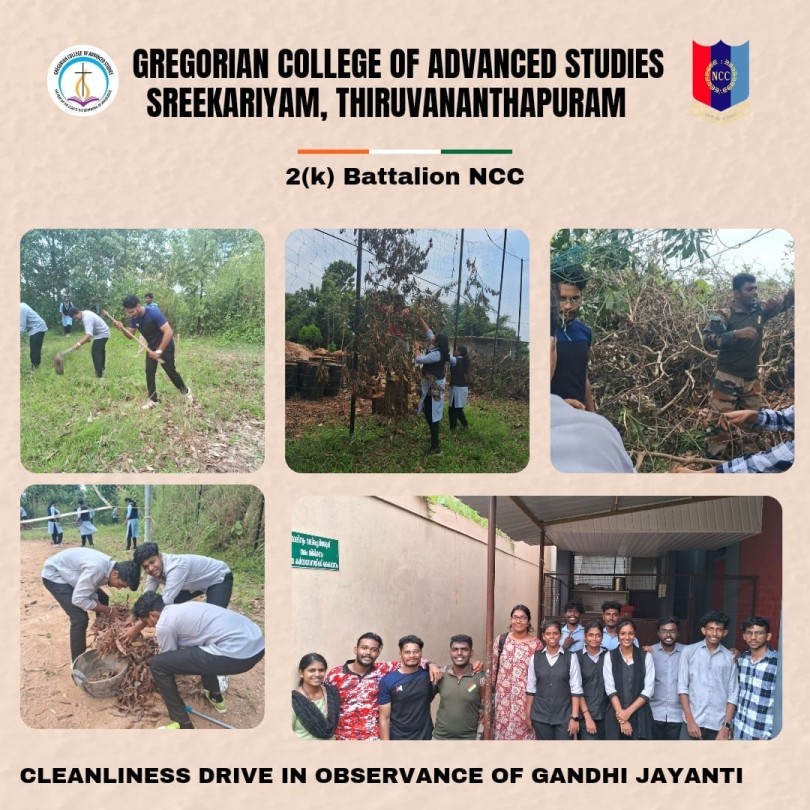 NCC Unit Commemorated Gandhi Jayanti, by conducting a Cleanliness Drive in the College campus at 2:00 pm on 1st October 2024. This Initiative was a part of the nationwide Swachhata Hi Sewa Abhiyan (SHS) 2024 Campaign, in response to a directive from the 2(k) Battalion. A total of 30 Cadets led by Mr. Arun Viswanadh( ANO) and Ms. Navami B (Caretaker) actively participated in the Environment Cleanliness Drive, equipped with cleaning tools, and worked diligently to clean the College Ground. Their collective efforts ensured that the area was spotlessly cleaned, contributing to the National Campaign for Cleanliness. The event served as a meaningful tribute to Mahatma Gandhis Principles of Responsibility and Community Service, while promoting the importance of a cleaner and healthier Environment.